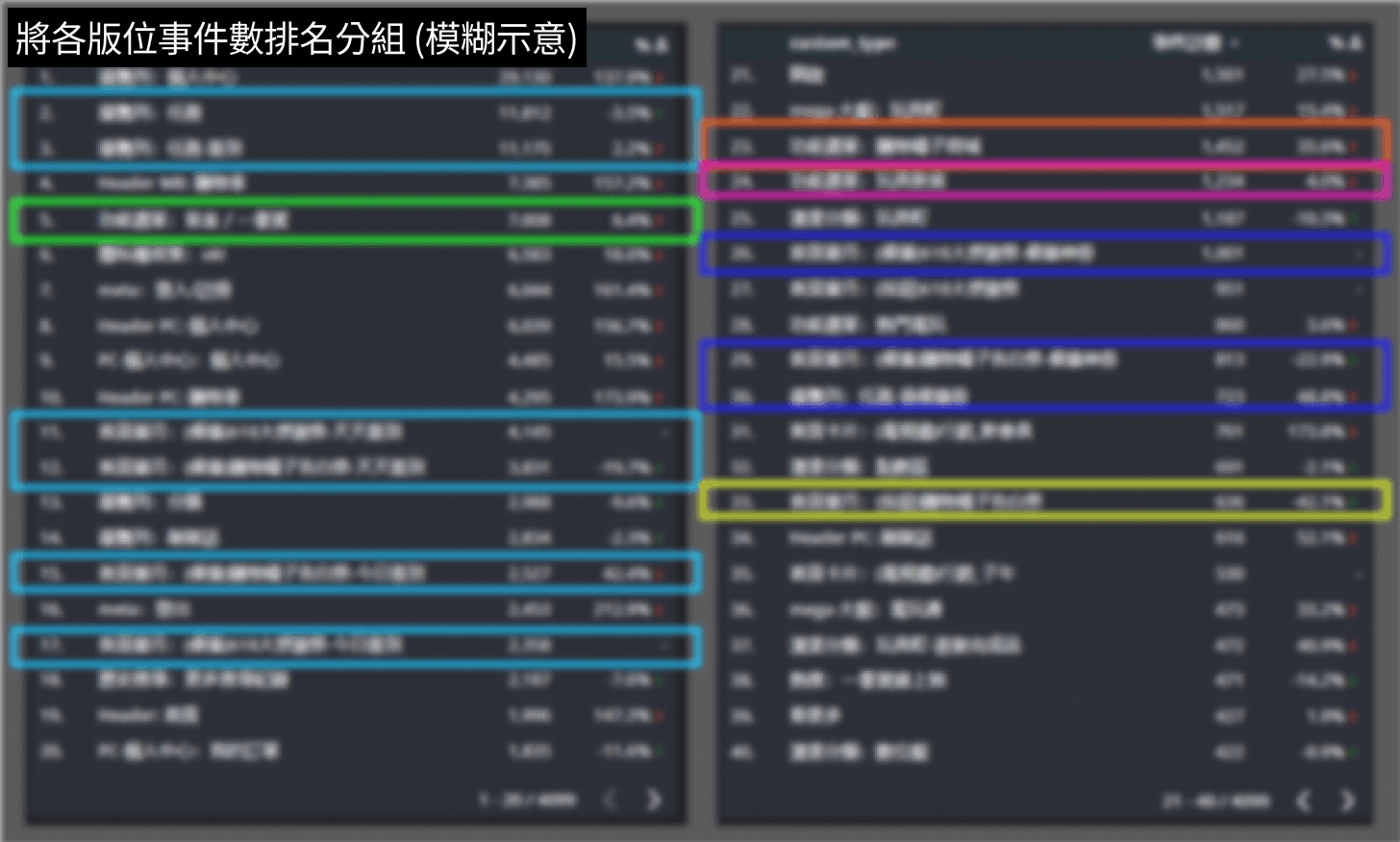 挑出事件數最多的幾大版位,對照熱點圖並將其分組,以利釐清後續重新排版的優先度。